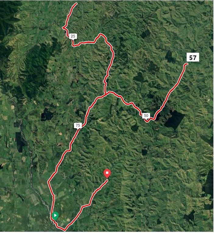 0 km Start - Head north-west on Opaki Kaiparoro Rd towards Mauriceville 11.0 km Turn right to stay on Opaki Kaiparoro Rd towards Dreyers Rock Rd 26.2 km Turn right onto Falkner Rd 29.4 km U-TURN Head south on Falkner Rd towards Mauriceville Rd 32.5 km Turn left onto Mauriceville Rd/ Opaki Kaiparoro Rd 47.7 km Turn left onto Mauriceville Rd/ Opaki Kaiparoro Rd – By overbridge 53.7 km Head south on Opaki Kaiparoro Rd towards Harvey St 59.3 km Turn left onto Bluff Rangitumau Rd 60.6 km Turn left to stay on Bluff Rangitumau Rd 65.3 km Head north on Bluff Rangitumau Rd towards Kaka Amu Rd 65.5 km Slight right onto Kaka Amu Rd – Go pass the Hall 66.8 km Continue on Kaka Amu Rd towards the finish 67.3 km Finish